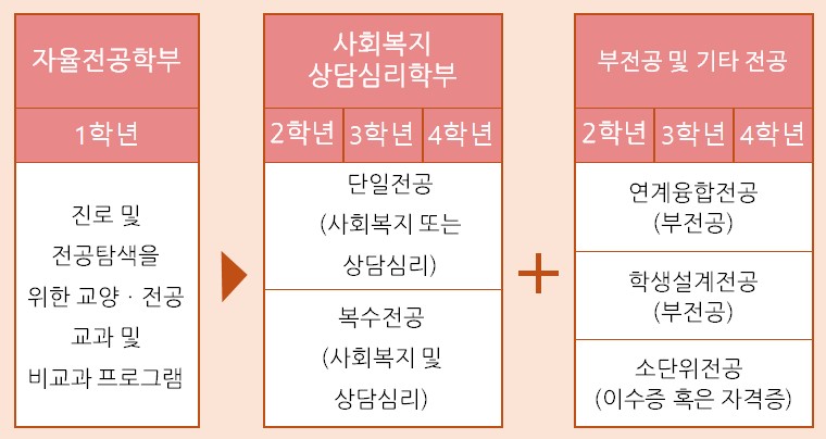 2학년 부터는 사회복지상담심리학부로 진급하여 사회복지 혹은 상담 심리 단일전공을 선택하거나 두 학위과정 모두 이수할 수 있는 복수전공을 선택하여 수강할 수 있습니다. 또한 청소년상담학 등 연계융합전공 이수, 자기주도형 전공설계를 통한 부전공 학위 취득도 가능합니다.